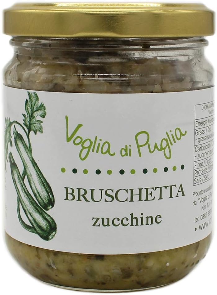 Categorie Olii extravergine d'olivaMarmellate e confettureComposte per formaggiDolciPasta artigianaleRegionaleAlle verdurePasta biancaTaralli & co.DolciSalatiSughi, creme e sottoliSottoliPatè e cremeCondimenti per pastaCreme piccanti e superpiccantiViniBianchiRosatiRossiDolci da meditazioneLiquori Bruschetta Zucchine In Olio Extravergine D’oliva 190g