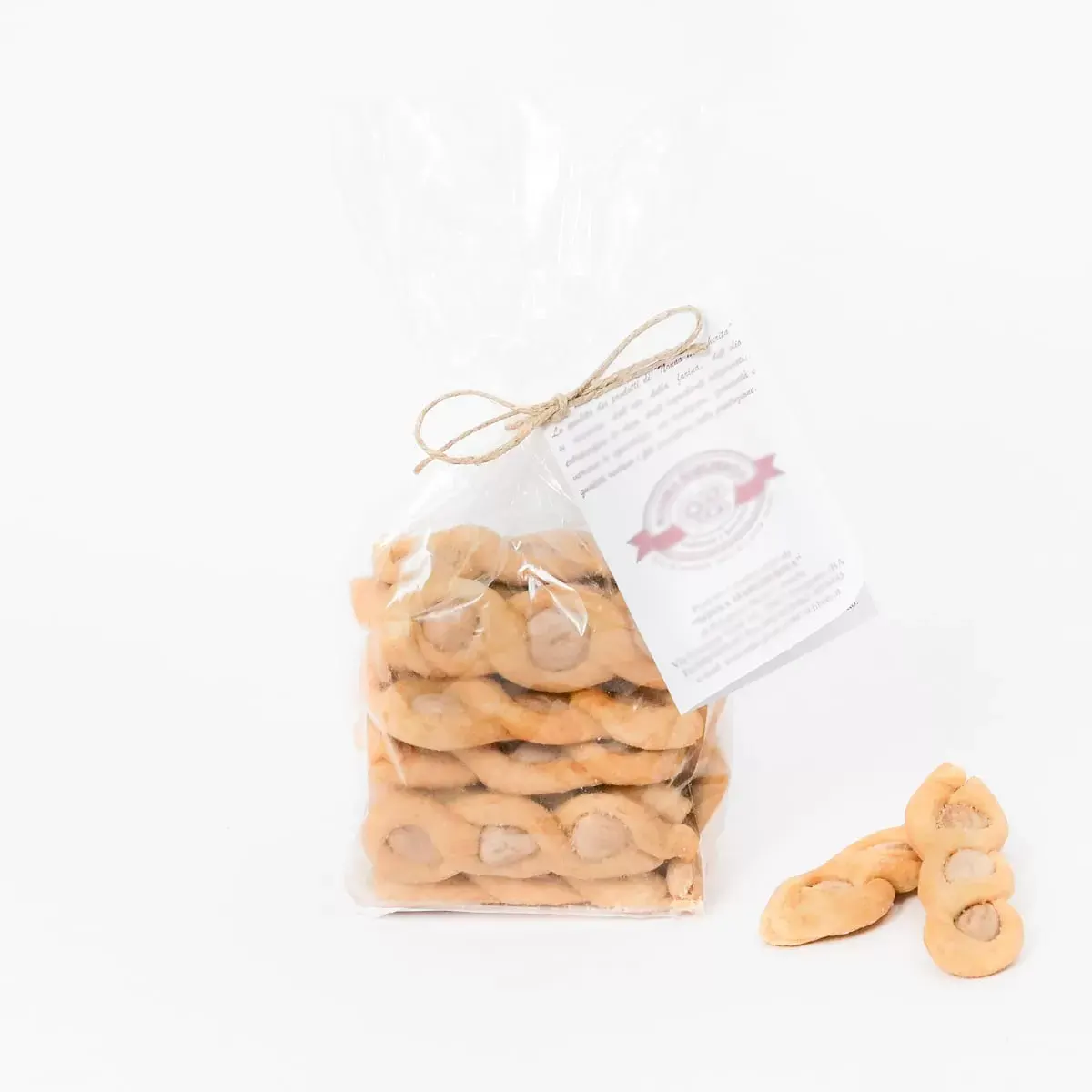 Il prodotto che rappresenta al meglio la tradizione pugliese: si tratta di trecce di farina, salate, con olio extravergine d’oliva, vino e mandorle selezionate e rigorosamente italiane. Sebbene anticamente si offrivano in versione dolce per i matrimoni come portafortuna per gli sposi, nel tempo sono state riadattate anche nella loro versione salata per accompagnare anche gli aperitivi salati. Sono ideali infatti da accompagnare ad un fresco aperitivo con un calice di vino bianco. Ingredienti: Farina di grano tipo “00”, mandorle, vino bianco (contiene solfiti), olio extravergine di oliva, olio di oliva, sale. Confezione da 300 gr